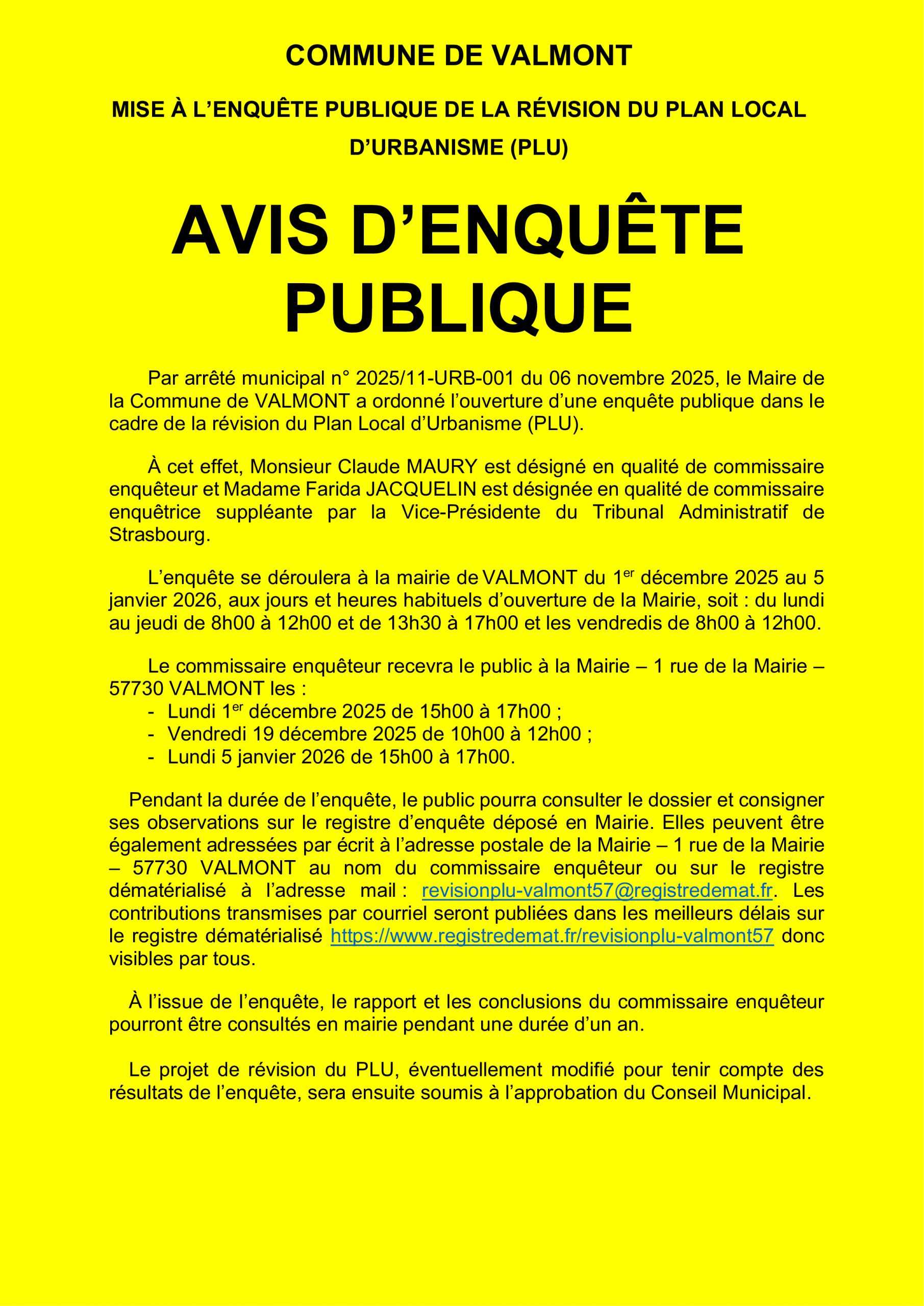 La commune de Valmont informe que la révision du Plan Local d’Urbanisme (PLU) fait l’objet d’une enquête publique.