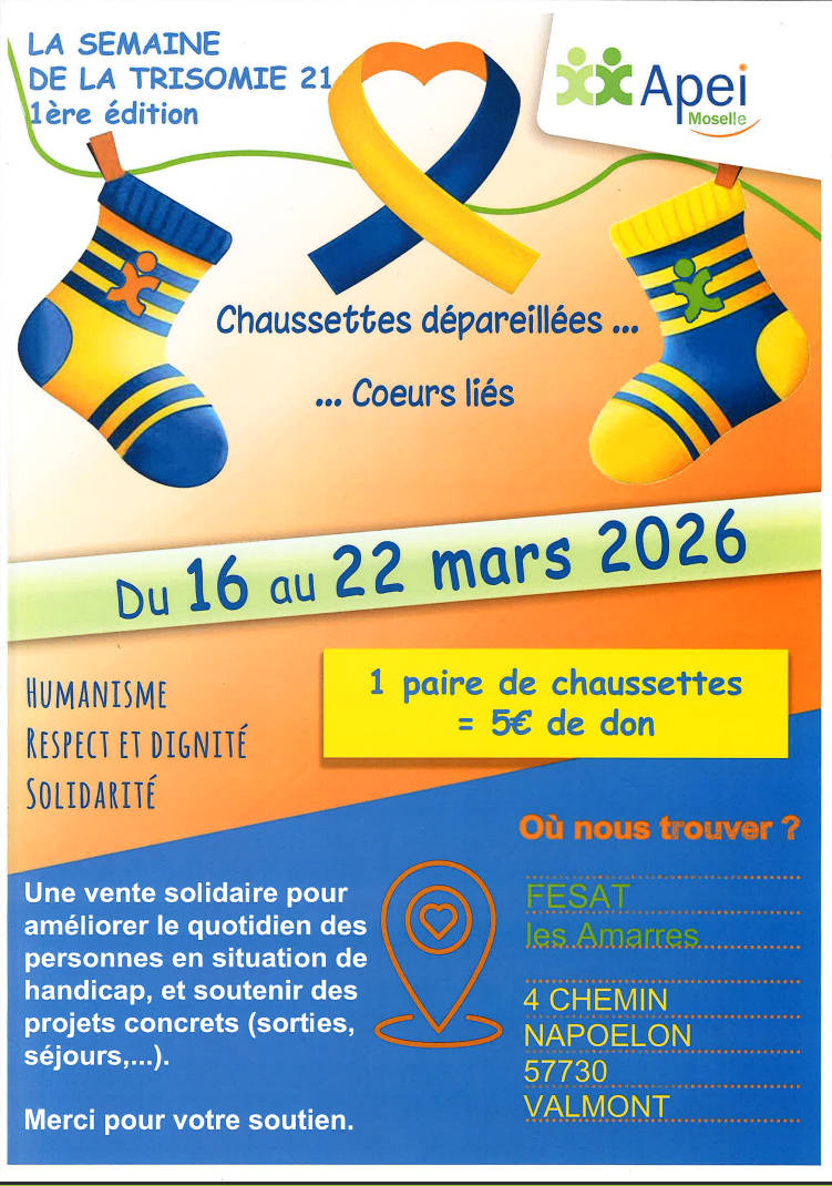 A l’occassion de la Semaine de la trisomie 21, du 16 au 22 mars 2026, l’Apei Moselle organise pour la première fois une grande opération solidaire intitulée « Chaussettes dépareillées, coeurs liés »