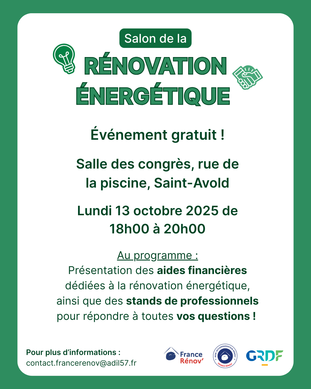 France Rénov’ organise un salon dédié à la rénovation énergétique le lundi 13 octobre 2025, de 18h à 20h, à la Salle des Congrès de Saint-Avold.