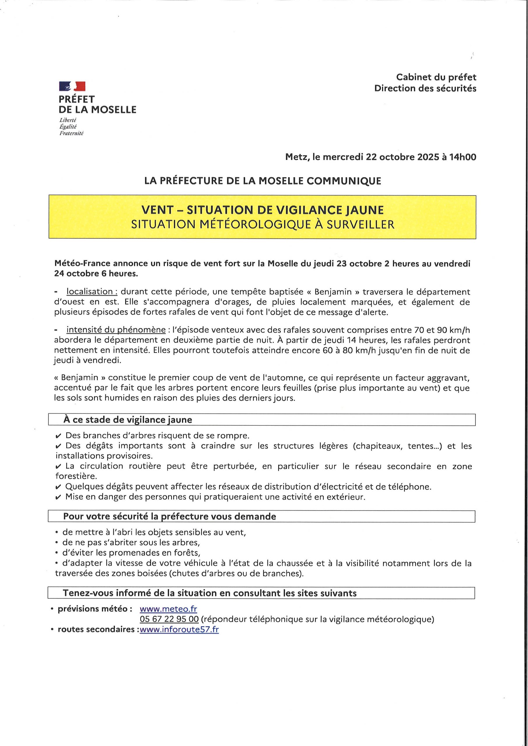 Alerte Vigilance Jaune – Moselle La Préfecture de la Moselle nous informe d’un passage en vigilance jaune à compter de : Mercredi 25 juin à 20h jusqu’au jeudi 26 juin à 6h Restez attentifs et adoptez les bons réflexes de sécurité selon les consignes en vigueur. Suivez...